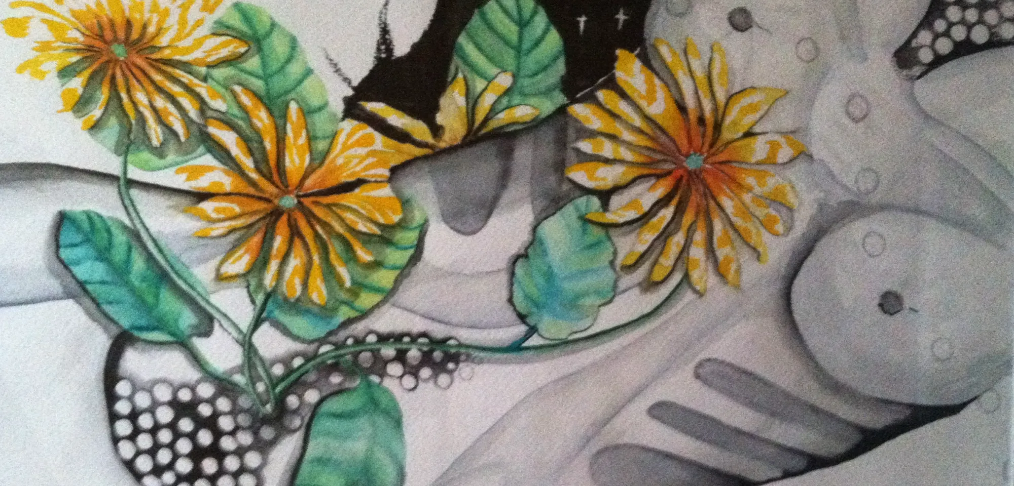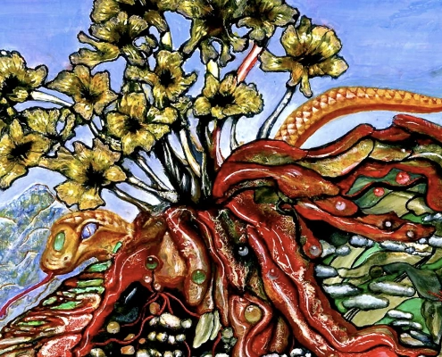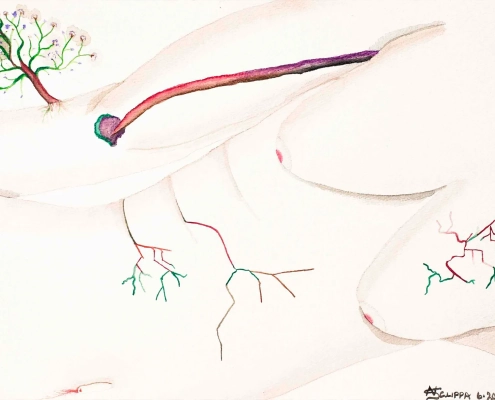 “the body as landscape, seen through the beauty of the woman: woman as earth, mother earth, how we put roots down (dryads), become the sun (morning moon over mountain), are nourished by nature (skin like bark, hair like leaves, movements of water cascading, bleeding with the moon’s cycle), brightened by flowers (are flowers), stimulated by thorns (acupuncture, thistle, rose thorns), burned on the pyre (“witches,” healers), soothed by stone (hardened into soft marble statues, muscles rubbed out by rounded pebbles), enlivened by love (bubbles bursting forth, water dancers crashing in waves)… and the landscape we wear as the history of our existence (scars, lost organs, burst hearts-breaking, limbs akimbo, bags under eyes, big teeth that want to show themselves, arches of backs that wish to bend further, hands that cannot grasp their desire or that free them as well, breasts swollen with children unborn, atrophied muscles, missing faces, all heart and blood, life in motion)..