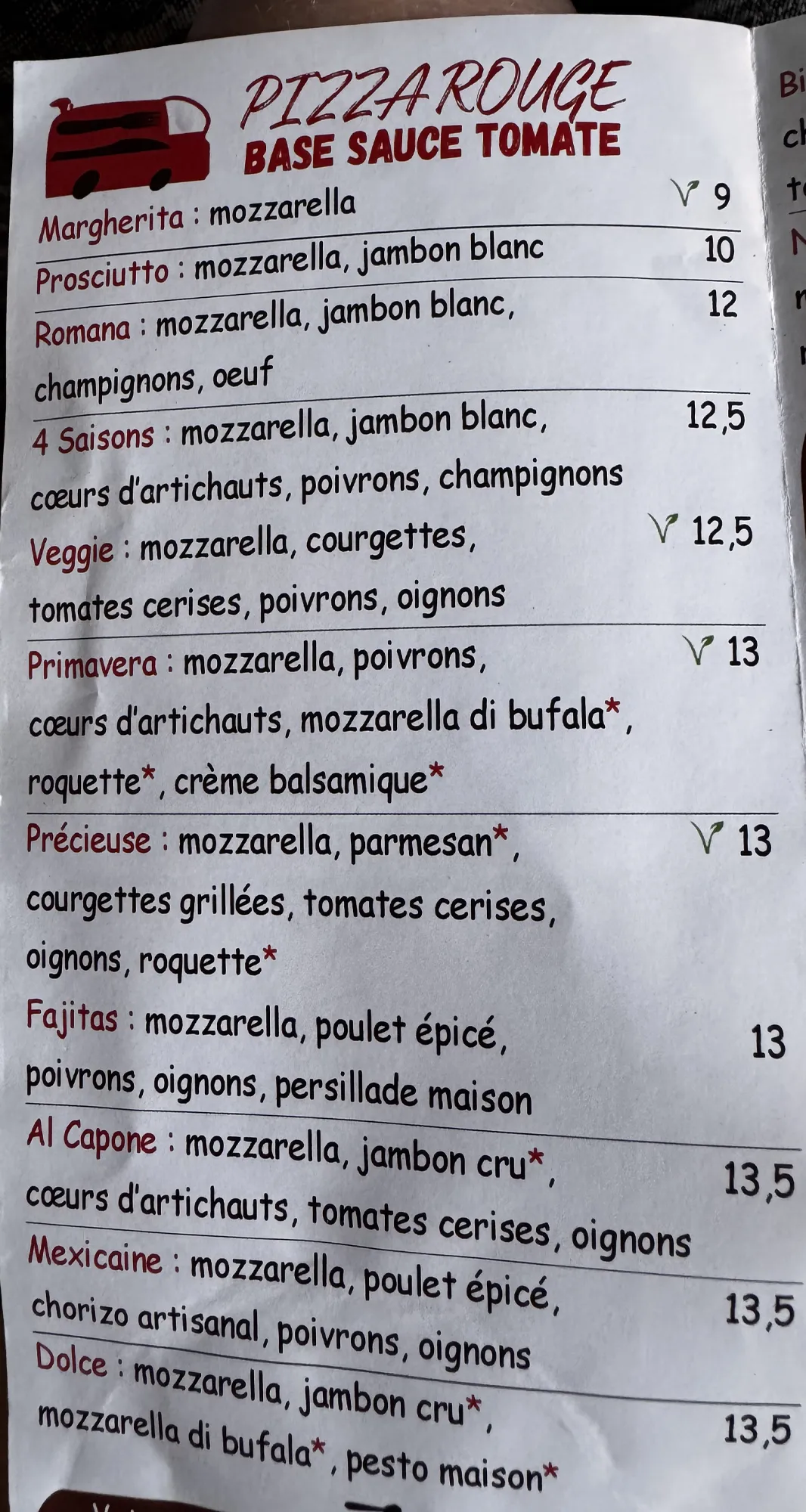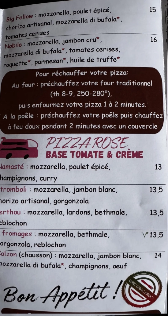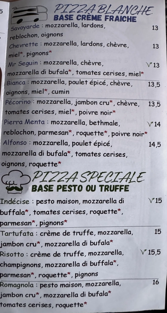 Julien’s pizzas are well worth the 2-3 hour wait, but also why I asked him if we can order in advance! So please peruse his white, rose and red sauce selections, and let me know by noon that day. Then you’ll be able to stroll up to his truck and pick up your pie throughout the evening (he stays until like 9:30). Chez Titi has his patio in the same parking lot, right in the center of Belesta, to sit and order a glass of wine or beer, soda or water… or take it back to your place, or mine. I’ll have some salad available at my place to supplement all of the bread and cheese. 🙂 My favorite pizza is his Chevrette – the little goat – under the Creme Fraiche base selections.